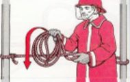 ![]() Figura 32: El nudo de ballestrinque con un seguro y cote es usado para izar o bajar una "línea de mangueras" cargada. |