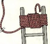 ![]() Figura 29: Ponga el lazo sobre los extremos de los largueros y la cuerda se pasa por debajo de los peldaños, entre los largueros, hasta el extremo de la escalera. |