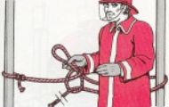 ![]() Figura 32: El nudo de ballestrinque con un seguro y cote es usado para izar o bajar una "línea de mangueras" cargada. |